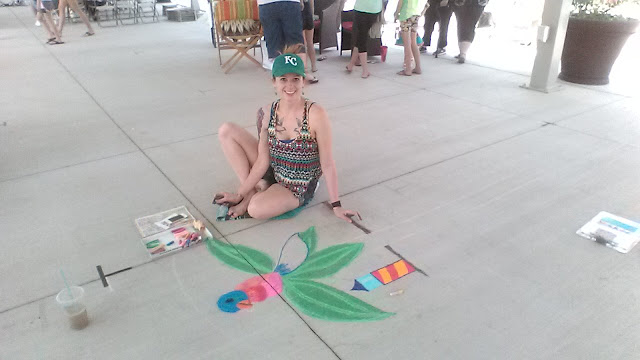 The Raymore Summer Scene was a neat festival! I'm glad we were invited to chalk there. The music was great, the community-decorated Adirondack chairs were lovely, and, best of all, we got to work in the shade all day, which made the heat much more bearable!! As a bonus, I got to see an artist friend who lives in Raymore, Heather Gambrell. She and her family painted the beautiful, oversized Adirondack chair that says "Raymore," pictured below.